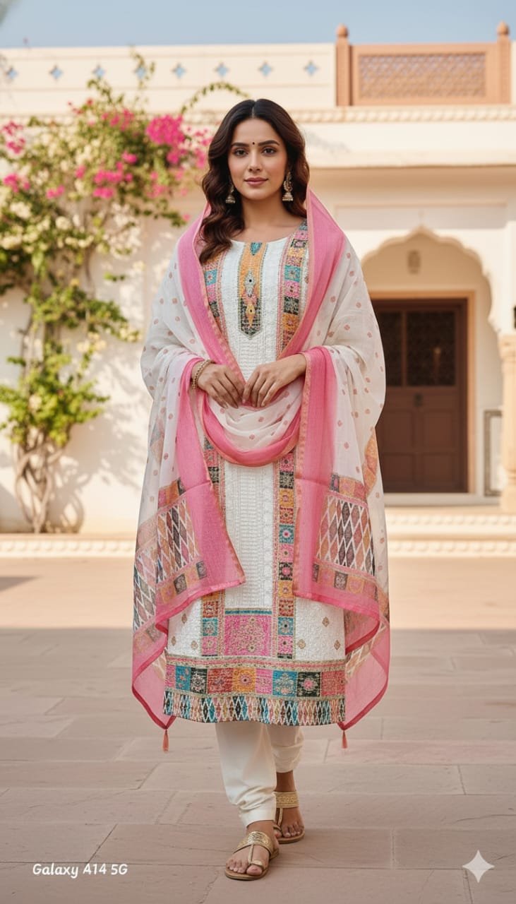 👗 Color: Elegant White with Multi-Color Thread Work